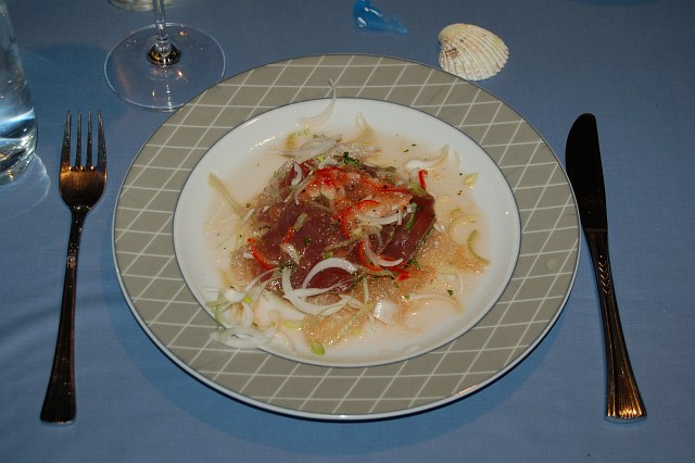 Marinierter Thunfisch in Korianderhülle auf frittierten Glasnudeln. | |