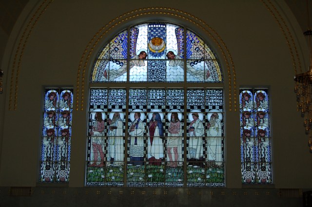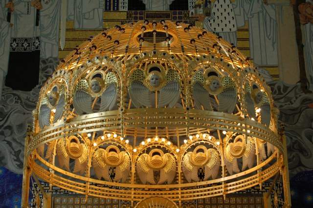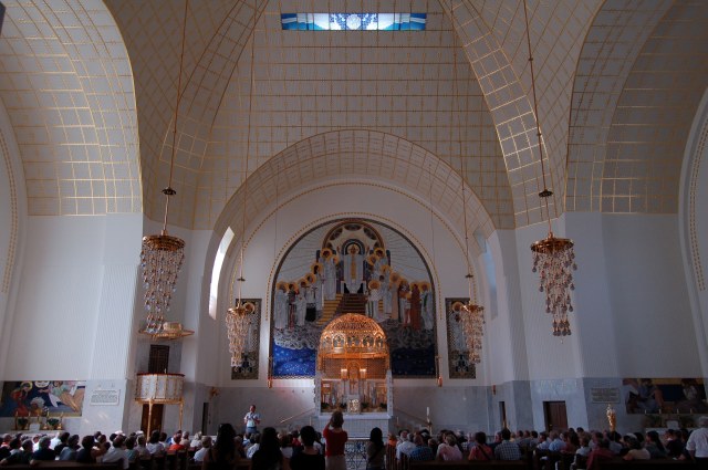 | Die beiden Glasfenster von Koloman Moser sind ebenfalls wichtige Teile des Gesamtkunstwerkes. Weitere Fotos von der Kirche gibt's auf: |