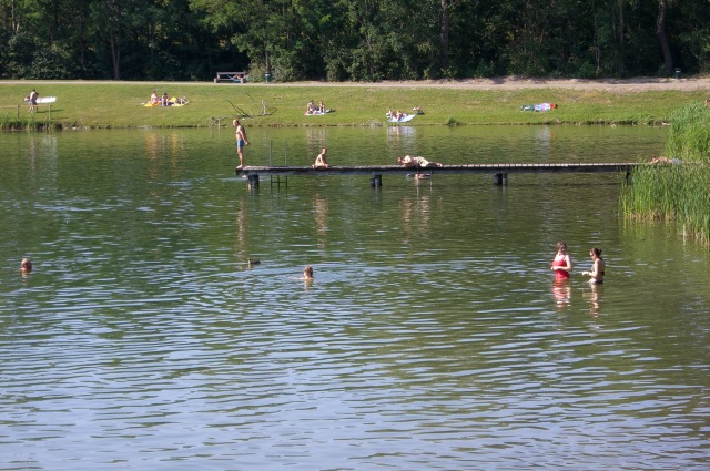 | Während Roland noch prüfend am Steg Ausschau hält (vielleicht nach Piraten oder ob doch einen Flotte kommt?), stehen Ali und Corinna bereits im Wasser und Sieglinde legt sich sogar schon mit der etwas konsternierten Entenmama an. | ||