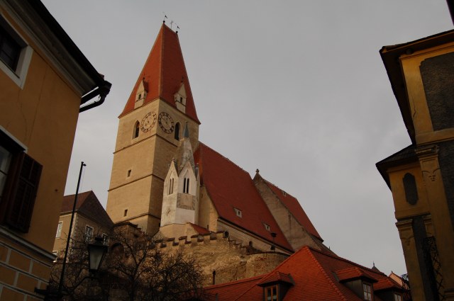 | Der weiße Kirchturm von Weißenkirchen ist gut versteckt. | ||