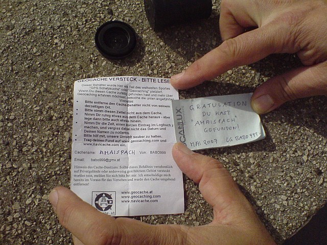 Irgendwie hat mich diese Geo-Caching Geschichte angesteckt und ich habe ein bissl im Internet recherchiert und einen Cache ganz in der Nähe, genannt "Amaispach", im Internet gefunden. Nach genauem Studium der Angaben und einigen Überlegungen bin ich am Montag mit Michael in der Mittagspause schnurstracks zu meinem vermuteten Versteck gegangen und habe prompt etwas gefunden - ganz ohne GPS! | |