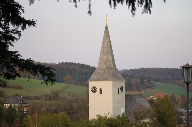 | Zurück in Kaumberg mit der etwas lieblos hingepappten Kirchturmuhr. | ![]() |