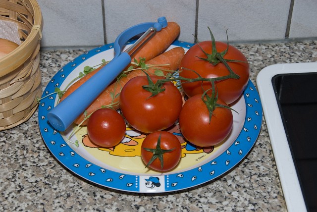 | Dann wurde für die Vorspeise Käse gerieben und Gemüse geschnitten. | ![]() |