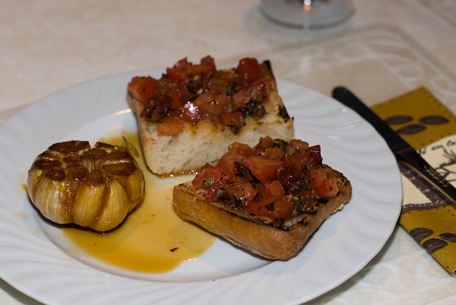 In Weißwein gedämpfter, karamelisierter Knoblauch mit Tomaten-Sardellen-Bruscetta. | |
