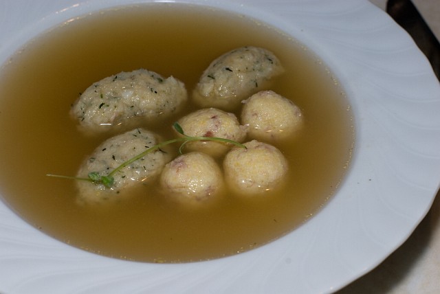 Räucherforellen-Nockerln und Polenta-Proscutto-Parmesan Knöderln in Rindsuppe. | |