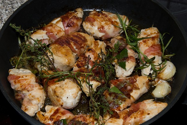 | Für das Hauptgericht wurden Hühnerbruststücke mit Speck und frischem Lorbeerblatt umwickelt un mit Thymian und Rosmarien angebraten. | ![]() |