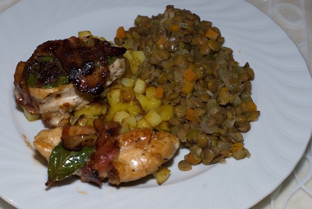 Hühnerfilet mit Lorbeer und Speck auf Erdäpfelbett mit Balsamico-Linsengemüse. | |