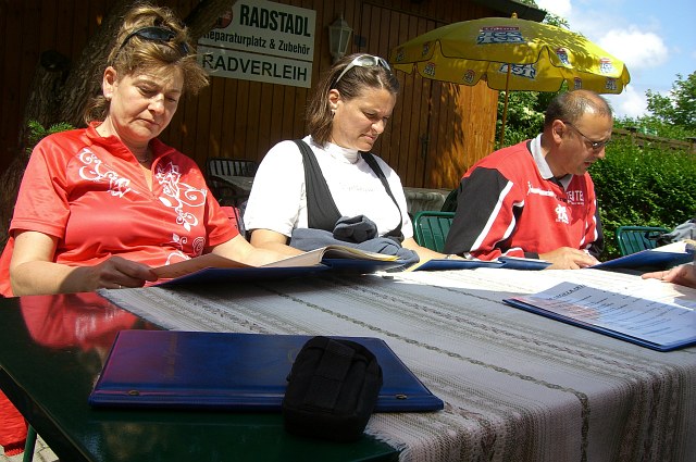 Regina hatte gröbere Probleme mit Ihrem Fahrrad, aber trotz eifriger Schrauberei brachten die Spezialisten auch nix zusammen und der Rückweg war eher mühsam. | |