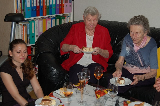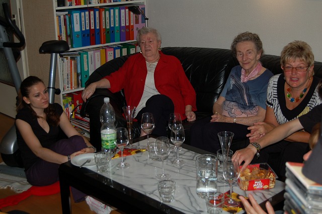 | Wir feierten Corinnas Geburtstag (30.9.) bereits am Wochenende. Sandra war leider verhindert und schickte nur ihren Hund, aber Oma war überraschend gut drauf. Sie beschwerte sich lauthals, dass ihre schönen Schuhe weg sind und sie für den 14. Juli im Rathaus schwarze Schuhe braucht. Dort gibt es nämlich eine Feierlichkeit zur "Diamantenen Hochzeit!" (60 Jahre). | ![]() |
