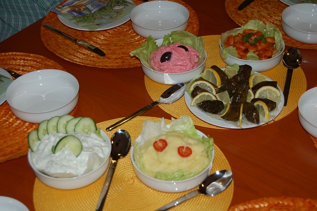 Diverse Vorspeisen, gefüllte Paradeiser und Paprika sowie Moussaka war das Ergebnis. | |