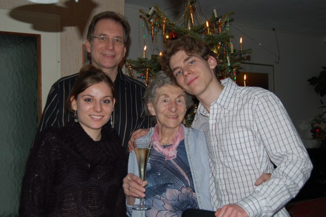 | Dann brachten wir Oma noch einen Blumenstock und ein Weihnachtsfoto in die Bettenstation. Sie wollte aber diesmal nicht mit uns kommen, nicht einmal ins Kaffeehaus. |