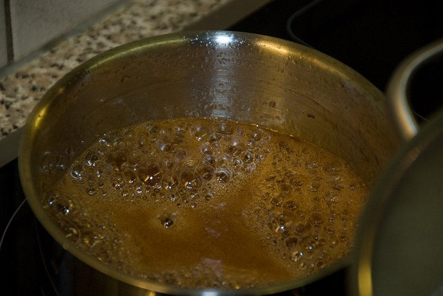 | Inzwischen wurde aus Himbeeressig, Ingwer und Zucker ein herrlicher Sirup für die Ente eingekocht. |