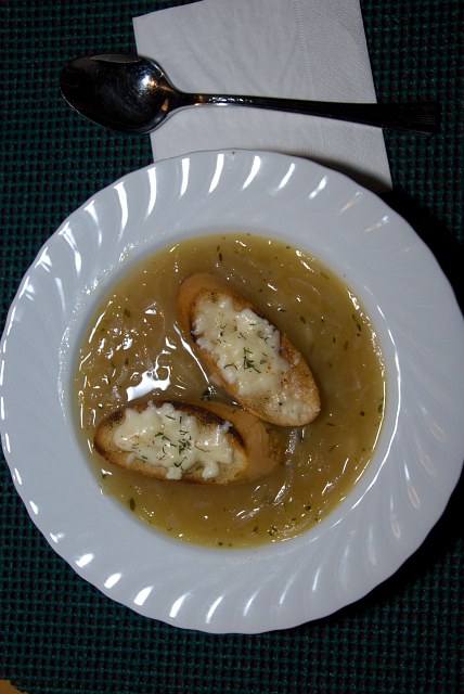 | Unser erstes Gericht: Französische Zwiebelsuppe. |