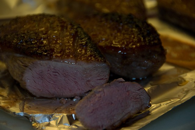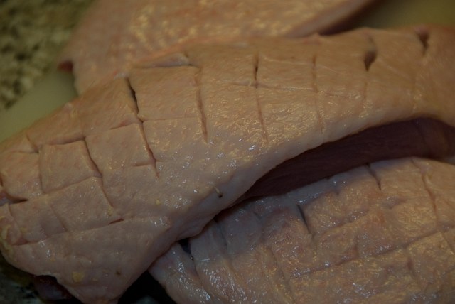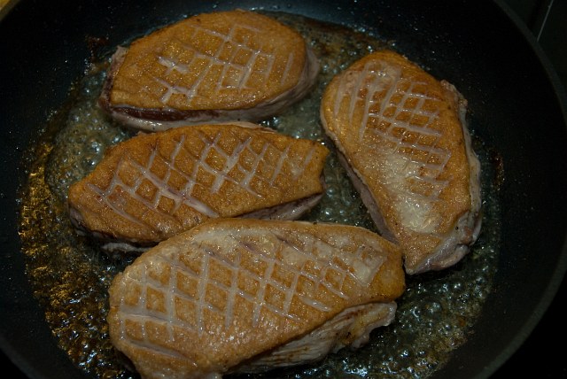 Die Entenbrüste wurden auf der Hautseite lange ausgebraten. | |