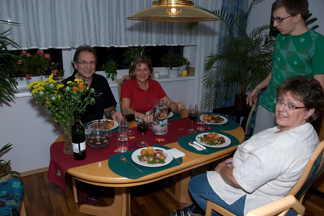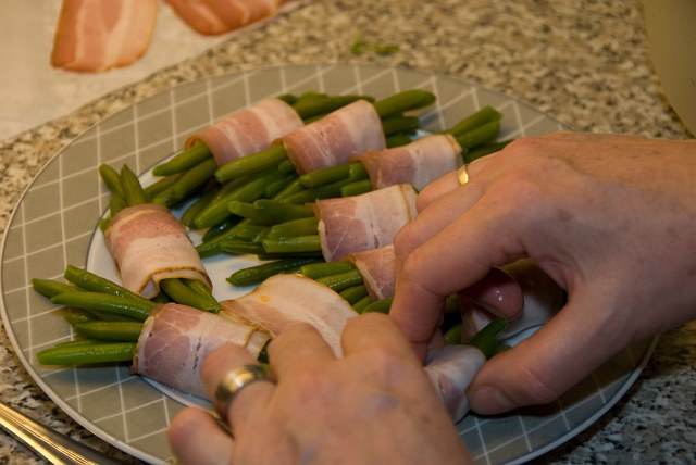 | Das Rezept sah zwar eigentlich Selleriegemüse als Beilage vor, aber wir einigten uns nach Ingrids Protest auf Fisolen im Speckmantel. |