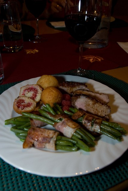 Hier ist der Hauptgang: Entenbrust mit Himbeer-Grießknödeln und Fisolen im Speckmantel. |