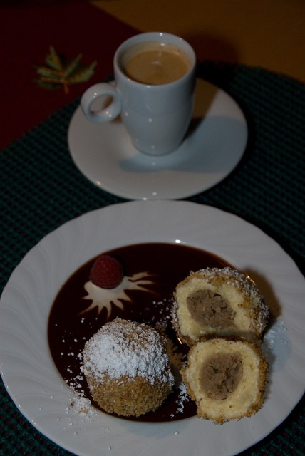 Und hier der Abschluss: Topfenködel mit Maronifülle auf Schokospiegel. Wir waren alle mit dem heutigen Ergebnis sehr zufrieden. |