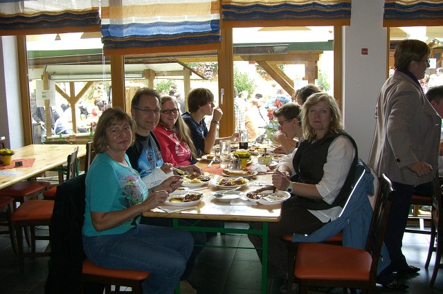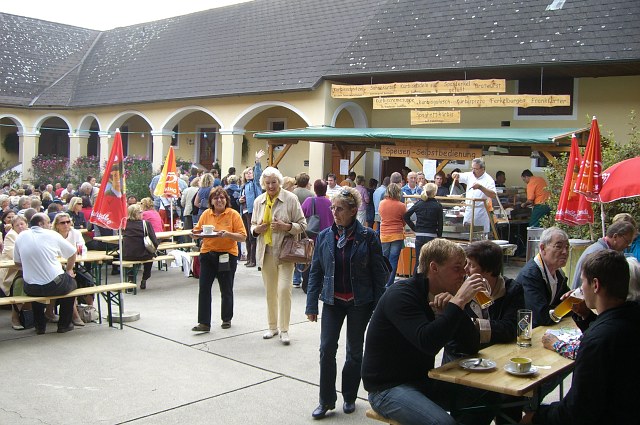 Im Hof waren alle Tische besetzt und das große Buffet war ziemlich belagert. | |