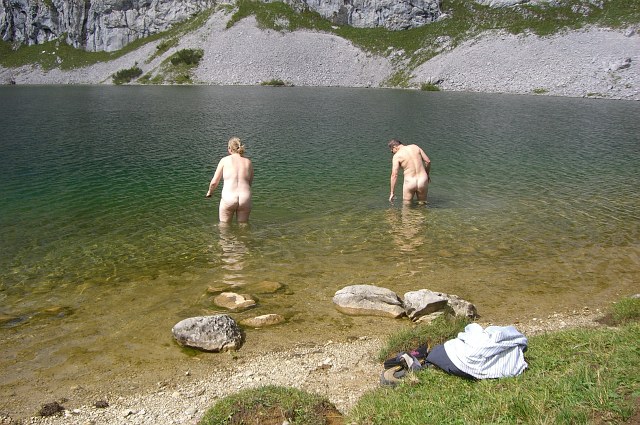 Monika redete schon die ganze Zeit vom Baden im See, da wollte ich ihr dann auch keine Gelegenheit für einen Rückzieher bieten und wir stürzten uns (vorsichtig) ins doch recht kühle Wasser. | |