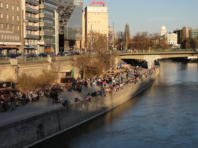 | Am Donaukanal säumen Sonnenhungrige Spaziergänger das Ufer. |