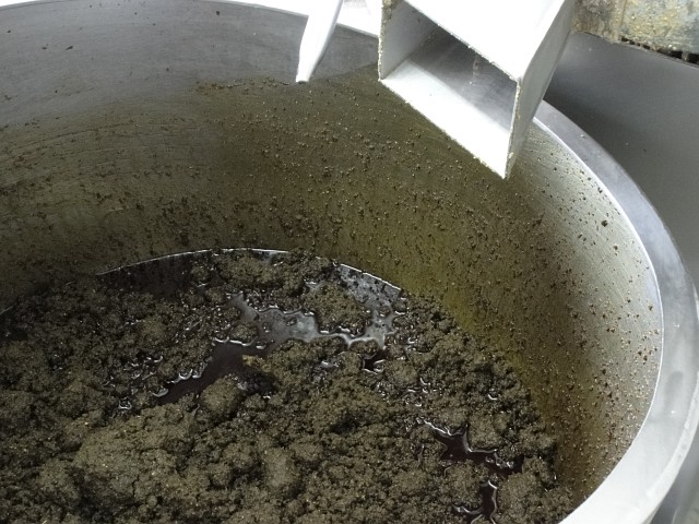 Zuerst werden die Kerne gehäckselt und mit Wasser und Salz geröstet. | |