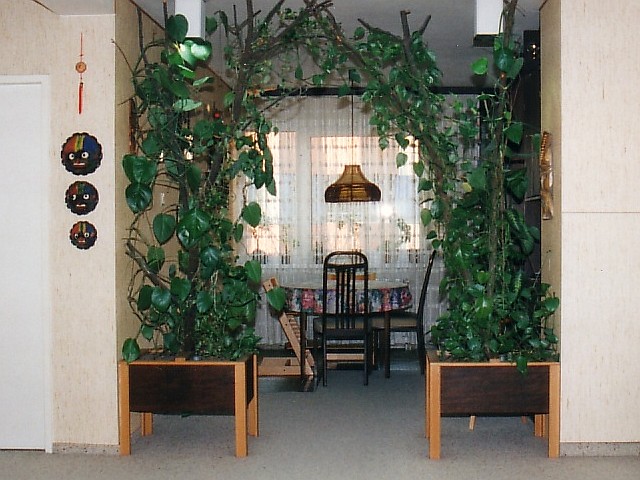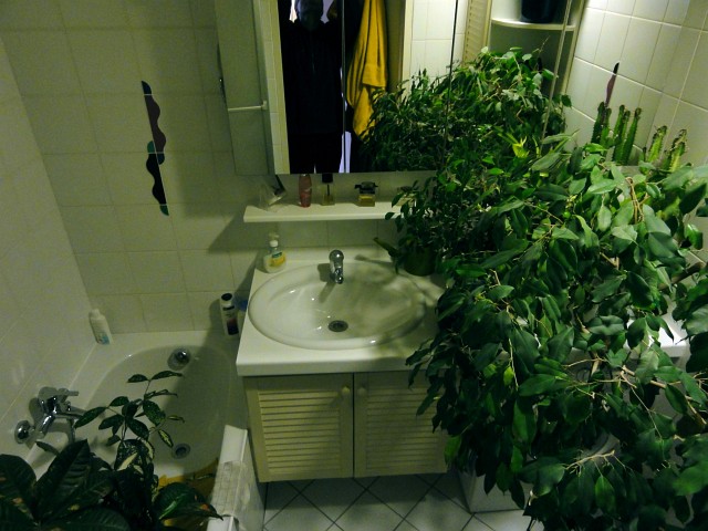 Die Blumen beim Fenster kamen inzwischen ins Ausweichquartier Badezimmer. Die beiden "Bäume" überstanden den Kälteeinbruch unbeschadet. | |