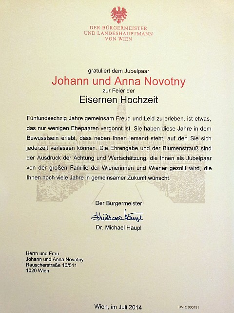 Amtlich und mit Unterschrift! Eiserne Hochzeit - das heißt 65 Jahre verheiratet! |