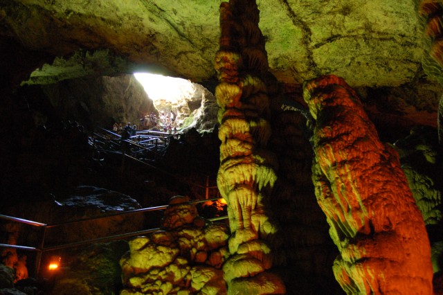 | Oben ein schöner Ausblick über die Hochebene und der Einstieg in die Tropfsteinhöhle. |