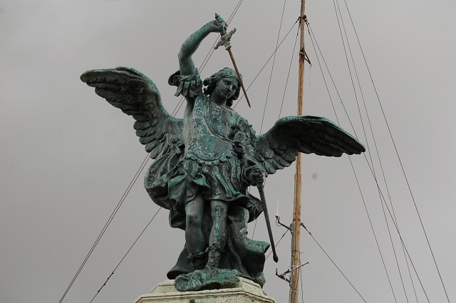 Der Legende nach sah Papst Gregor I. Erzengel Michael wie er sein Schwert in die Scheide steckte und damit das Ende der damals wütenden Pestepidemie angekündigt hat. | |
