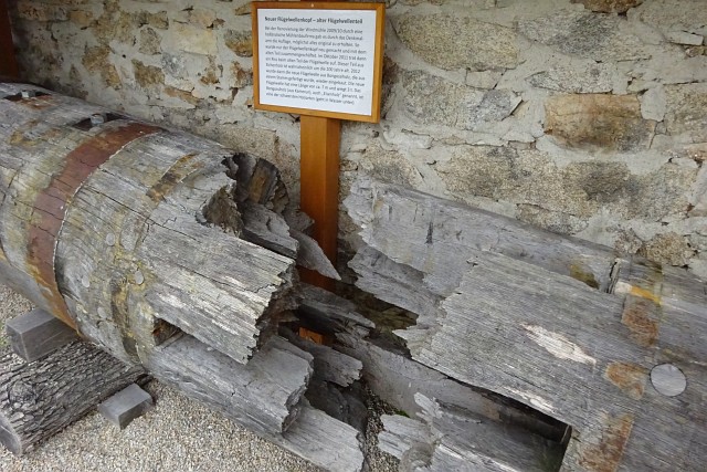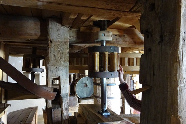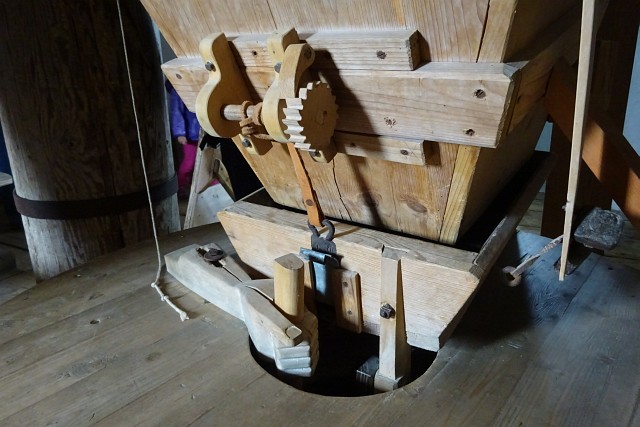 | Die hölzernen Zahnräder werden original mit Bienenwachs geschmiert. |