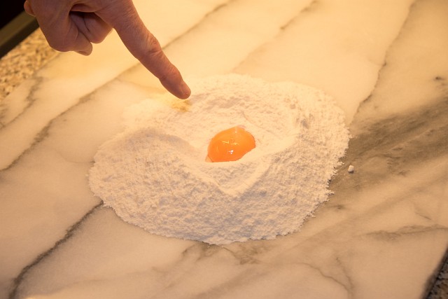 Der Nudelteig hat gerastet und wird nun gewalkt. | |