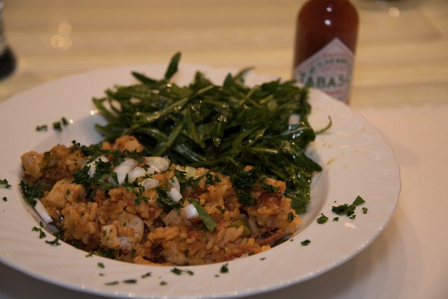 Der Hauptgang: Jambalaya mit Garnelen, Huhn, Chorizo und Rucola |