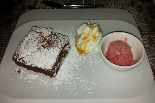 Zwei Stunden später endlich die Nachspeise: Warmer Schokokuchen mit Honigschlagobers und hausgemachtem Erbeereis. Dazu ein Muskateller. Dann waren wir in jeder Hinsicht fertig! |