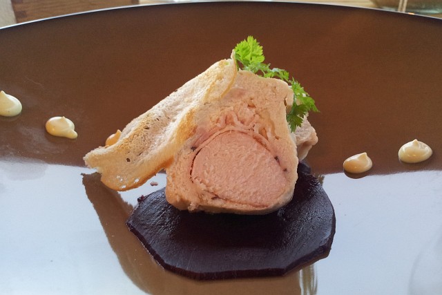 Vorspeise: Kaninchenterrine auf Rote-Rüben-Carpaccio. Dazu ein den Jungwein Filius. |