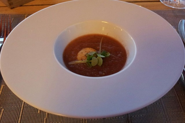 Gazpaccio mit gebratener Jakobsmuschel. Dazu ein Chardonney. |