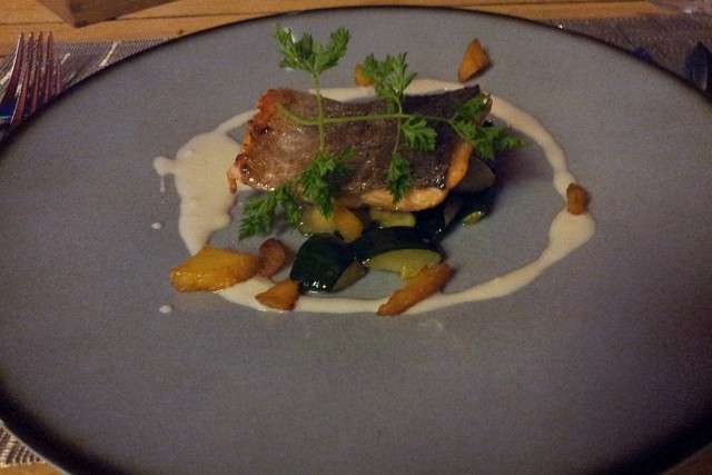Lachsforellenfilet auf Zucchinigemüse mit Weißweinsauce. Dazu ein Riesling. |