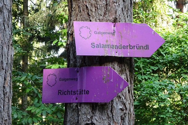 Die Galgenleitn Die drei Galgen sind düstere Zeugen aus einer Zeit als geistliche und weltliche Herren das Recht der Halsgerichtsbarkeit hatten, kurz, ihre Untertanen erhängen lassen konnten. Die Galgen standen ursprünglich an der Straße nach Kreisbach. Ein sensibler Lilienfelder Abt, der bei seinen Visitationen immer an den Galgen vorbeifahren musste, verabscheute diesen gruseligen Anblick und ließ diese auf den Dingelberg versetzen. Seither heißt dieser Hang "Golingleitn" |