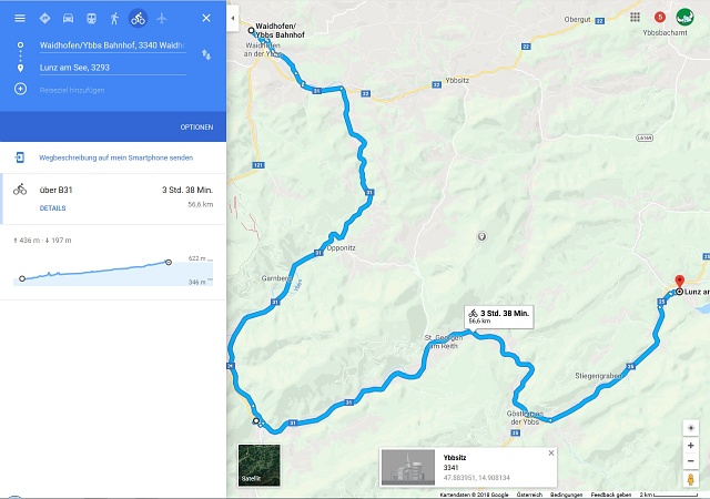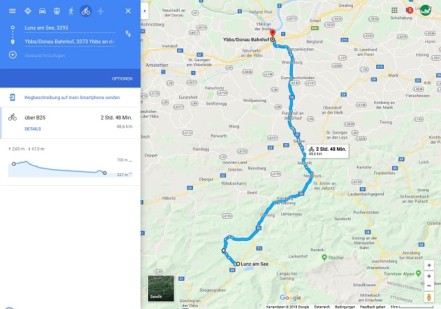 Zurück dann mit Fahrrad bis Ybbs an der Donau, Zug bis Amstetten, Auto bis nach Hause. |