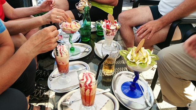 | Aber wir fanden eine Super Konditorei am Hauptplatz und ein Sportgeschäft, wo wir uns mit neuen Regenponchos ausstatteten. |